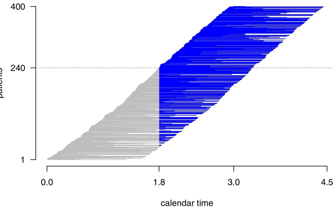 They consider an adaptive “two-stage” feature design of the trial. The first part consists of further follow-up data from patients who entered the trial before the interim analysis, but for whom further follow-up data were collected after the interim analysis. The second part comes from patients who entered the trial after the interim analysis. To define p-value critical values, they suggested to use the O’Brien-Fleming alpha-spending function approach. Sample size adaptations are made at the interim analysis. They also had to define a relevant tau, calculate relevant first stage sample size n1, and pre-specify reasonable weights, w1, and w2.