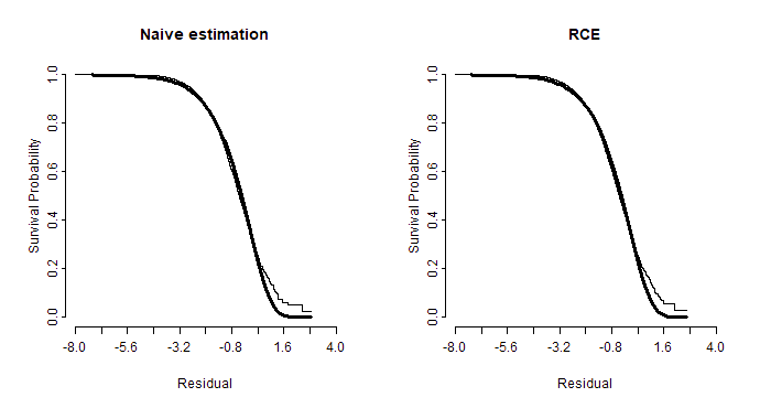 The authors then lay out additive measurement error and misclassification models. First they assume that the errors are non-differential. The true values of the X’s are related through surrogates through W’s via an additive error model: Wj = aj + bjXj + Uj where j=1…p and X is assumed to follow a multivariate normal distribution. Regression calibration (RC) is a widely accepted method to use for correcting measurement error. RC is the MLE of a likelihood function on the conditional expectation of true covariate on observed covariate. They show obtaining a regression calibration estimator (RCE) and native estimator using maximum likelihood approach with Newton-Raphson algorithm in the survreg function in the survival R package. They then go on to discuss issues with getting a closed form of the observed likelihood function and using an approximation from Gauss-Hermite Quadrature, but it is very computationally intensive and challenging if two covariates are measured incorrectly so they addressed this issue with AMLE in a Weibull regression model.
