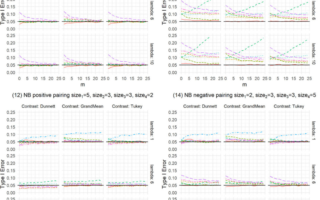 They also investigated multiple contrast tests that allow general contrasts (e.g., many-to-one or all-pairs comparisons) to analyze count data in multi-arm trials. Multiple comparisons to control or testing Grand-Mean contrasts, are of interest and will be implemented using multiple contrast test procedures (MCTPs) (Bretz et al. 2001; Konietschke et al. 2012).
